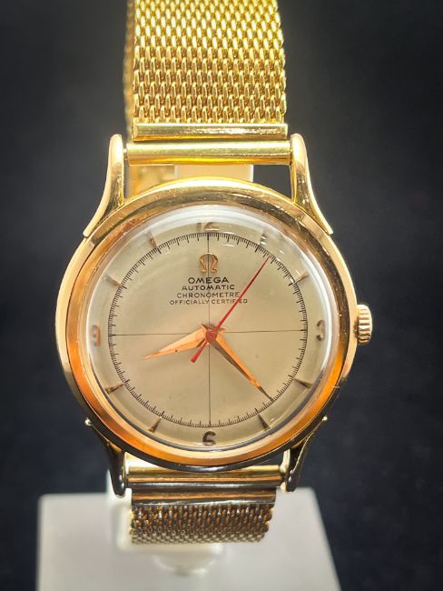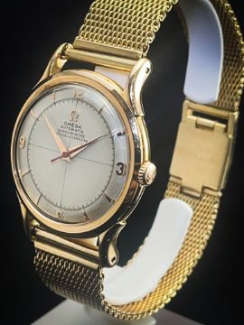 The Omega 2516 18k Gold Bumper Men's Watch from the 1950s is a vintage timepiece that combines luxury, precision, and timeless design. Known for its 18k solid gold case, bumper automatic movement, and gold-plated bracelet, this watch is a standout piece in Omega's rich history of craftsmanship and innovation. In the post-war era of the 1950s, Omega was highly regarded for creating watches that featured advanced technical designs with luxurious finishes. The Omega 2516 is no exception, offering an elegant and reliable watch with unique features that make it a prized collector’s item today.